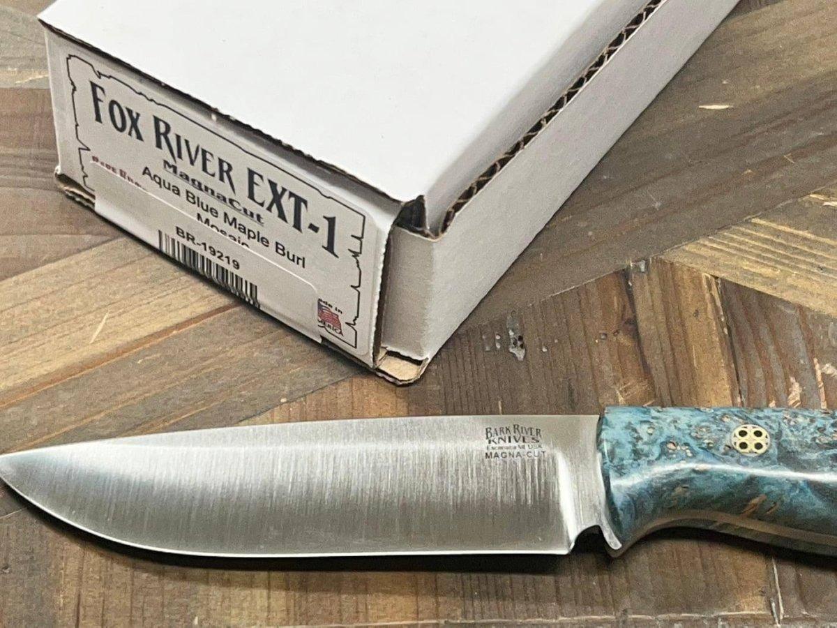 This premium Bark River Fox River EXT-1 is the perfect outdoor and field knife that comes in ultra-premium MagnaCut Knife steel with handmade Aqua Blue Maple Handles and Mosaic Pins!
