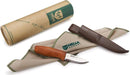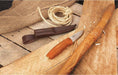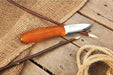 The Helle Skog Carving Knife is great for camp chores, as well as making a walking stick and decorating it with a spirit face or crafting a whimmy diddle. Knives are made to shape. Skog – named after the Scandinavian word for forest – was developed for evenings by the campfire in the forest, with a knife in one hand and a piece of greenwood in the other. At a little over 4 oz. (sheath and knife 7" long with a 3" blade), it is more robust than a typical carving knife but has great ergonomics to enable a grip close to the blade for carving. Triple laminated steel blade takes and holds an edge with a minimum of fuss. Comes with a sheath that holds the knife in a secure grip.