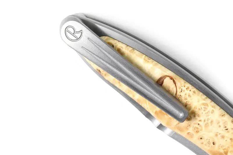 With hand polished finishes and a handle at 3.625" long, the Mnandi is among our smallest and sleekest low-profile folders. Box Elder Burl, a type of Maple, is a wood known for its exquisite and sometimes rosy burls. Wood Inlays are made from natural materials, so you can expect a variation in color and wood grain. All models are available with a dedicated left or right handed orientation. Damascus options available for an additional $200.