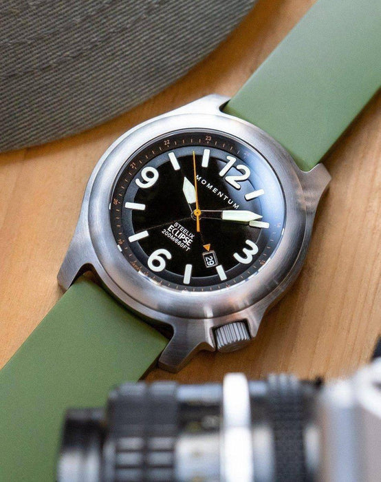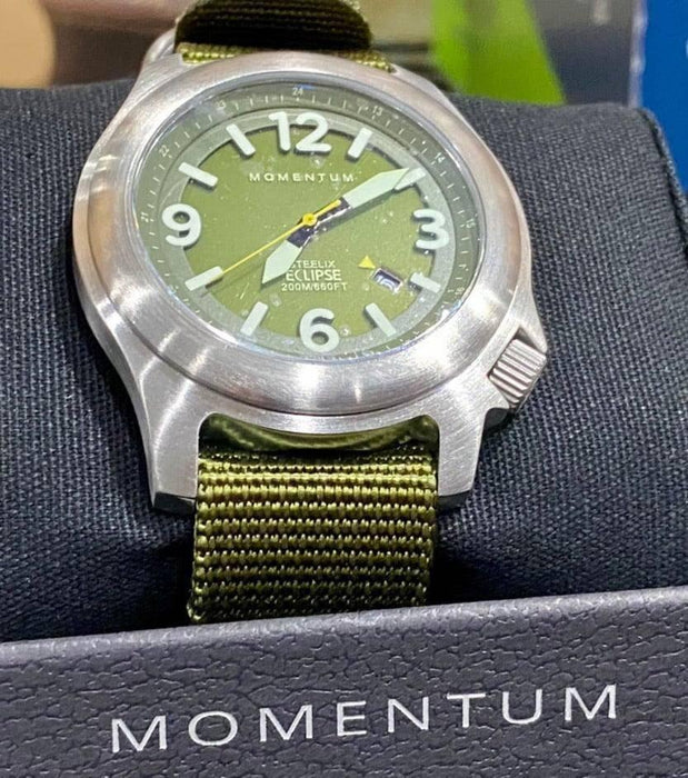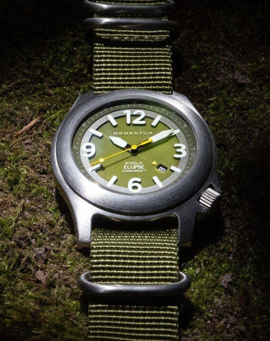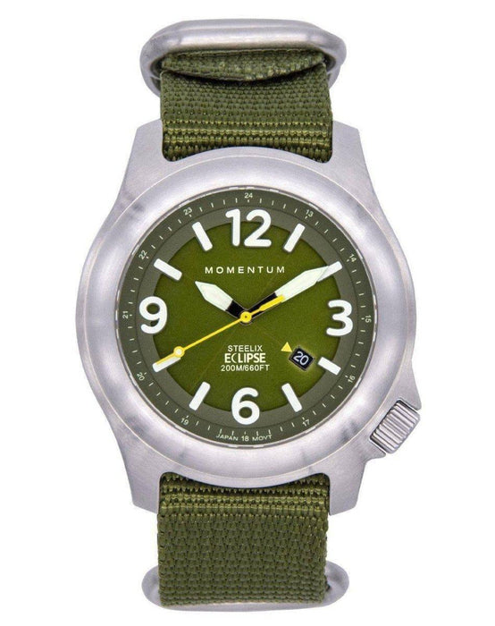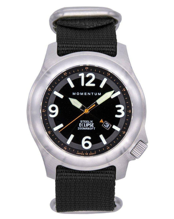 The Momentum Steelix Eclipse - Solar Watch makes a great adventure watch with ruggedness and style. The Steelix Eclipse is the next generation of the affordable field watch. Tested to a depth of 200M/660FT, with a screw-down crown and sapphire crystal, it also features a state-of-the-art solar-powered movement. The semi-transparent dial covers the solar-panel which powers the watch movement.