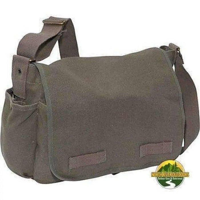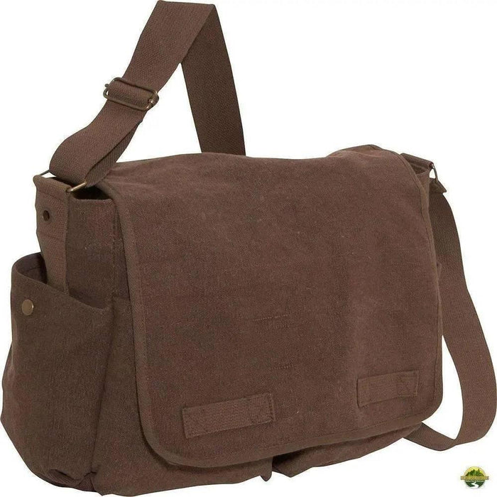 Rothco's Vintage Canvas Messenger Bag features include a heavyweight washed cotton canvas with an enormous main compartment, which can hold just about anything, from books to all your essential survival gear - this bag can hold it. Rothco’s messenger bag is the ultimate EDC, just ask Jack Bauer! Additional features to the messenger bag include an inside zipper pouch, 4 outside pockets, brass hardware, and 2" wide adjustable shoulder strap. The bag measures about 15" x 11" x 6".