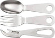 Camping table service that will assure you a happy camping day due to their high utility function. The set includes one each of 5-5/8" overall spoon, 5-1/2" overall fork and 5-5/8" overall knife with 2" partially serrated blade and bottle/can opener. One piece stainless construction with oversized lanyard holes for each. Includes an OD green nylon belt sheath to transport them all in a compact fashion.