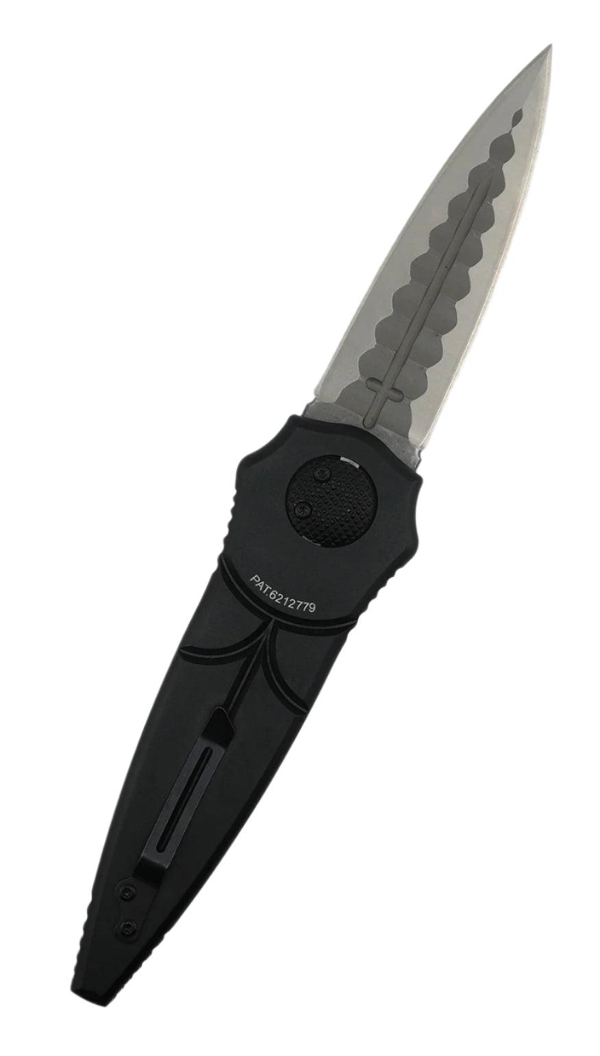 This Warlock knife has a beautiful black coated CPM-S30V steel, sorcerer ground double-edge cross dagger blade, and a black 6061-T6 aluminum handle.