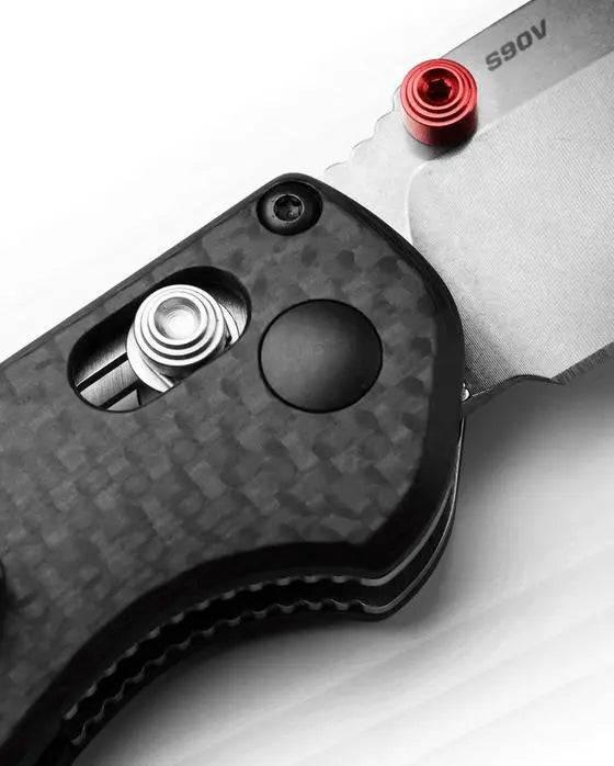 The Benchmade 565-1 Mini Freek is a luxury model of the already popular 565. It features a milled carbon fiber handle with true red barrel spacers and thumb studs. It uses Benchmade's famous AXIS Lock and includes a reversible pocket clip, making it truly ambidextrous. The blade is made of premium CPM-S90V stainless steel.