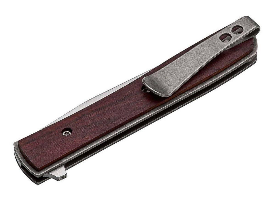 With a blade of only 7 cm, the smallest version of the Urban Trapper, the Petite, has become a good dea-l more compact and lighter and its version with dual Cocobolo scales now weighs only 33 grams! But the Urban Trapper Petite comes with the same high-quality equipment: a VG-10 blade satined longitudinally, titanium frame lock with ball bearing and reversible titanium clip (tip-up). This way, the Urban Trapper Petite opens a new dimension of gentlemen's folding knives. With high-quality nylon case for storage.