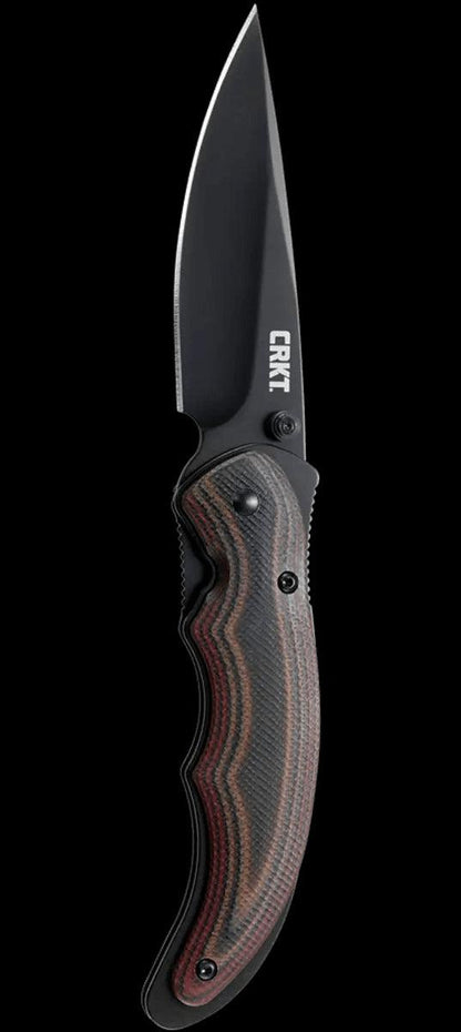 CRKT Endorser A/O knife 4-1/8" closed linerlock. 3-1/4" black finish 8Cr14MoV stainless drop point blade. Fire Safe thumb-stud opener secures the blade at the ready for when it's needed and the OutBurst assisted opening system allows blade to be opened quickly. Finger grooved multilayer black and brown G10 handles. Removable black finish stainless pocket clip. MJ Lerch design. Chosen as Best Buy of the Year at recent Blade Show.
