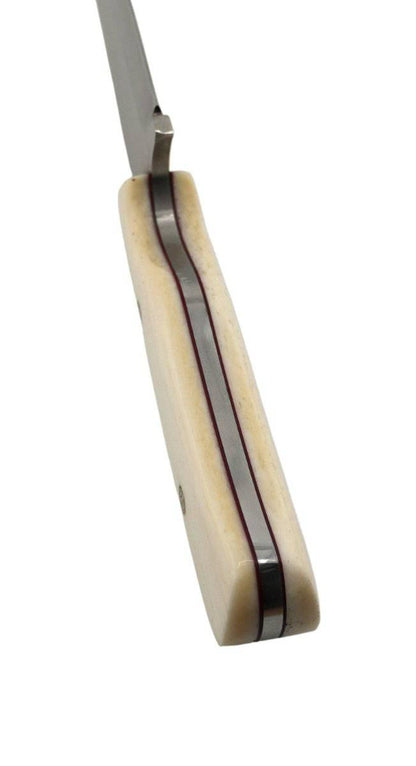 This local made bushcraft and field knife by CUR Custom Blades is a Shrike EDC Fixed Blade Knife 3.25" made with Oiled Bone Scales, Dark Liners and Mosaic Pins.