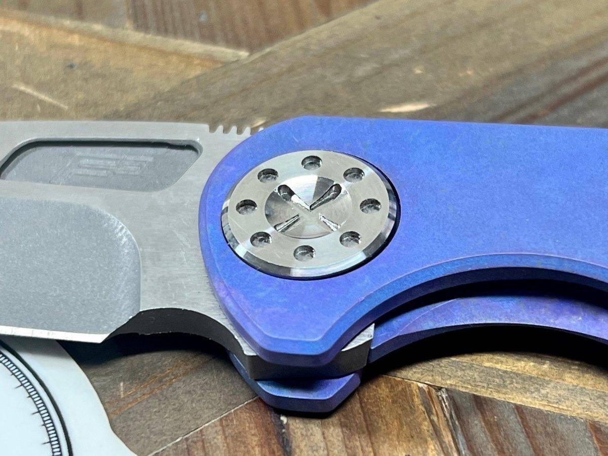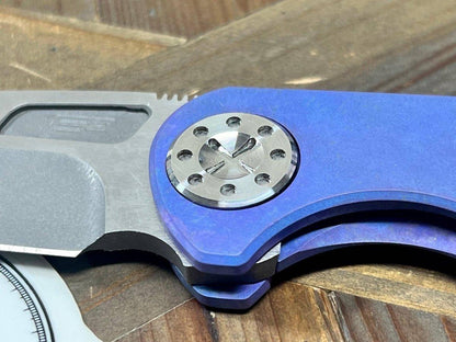 This blade has been anodized in blurple monster with gold/bronze titanium clip in our professional knife shop. This knife is one-of-a-kind and only 1 available! Picture is the actual knife you will receive