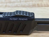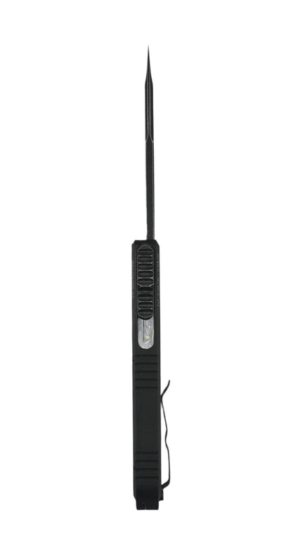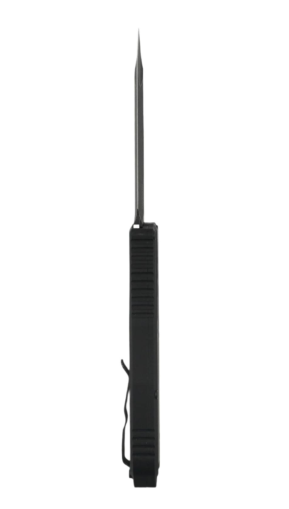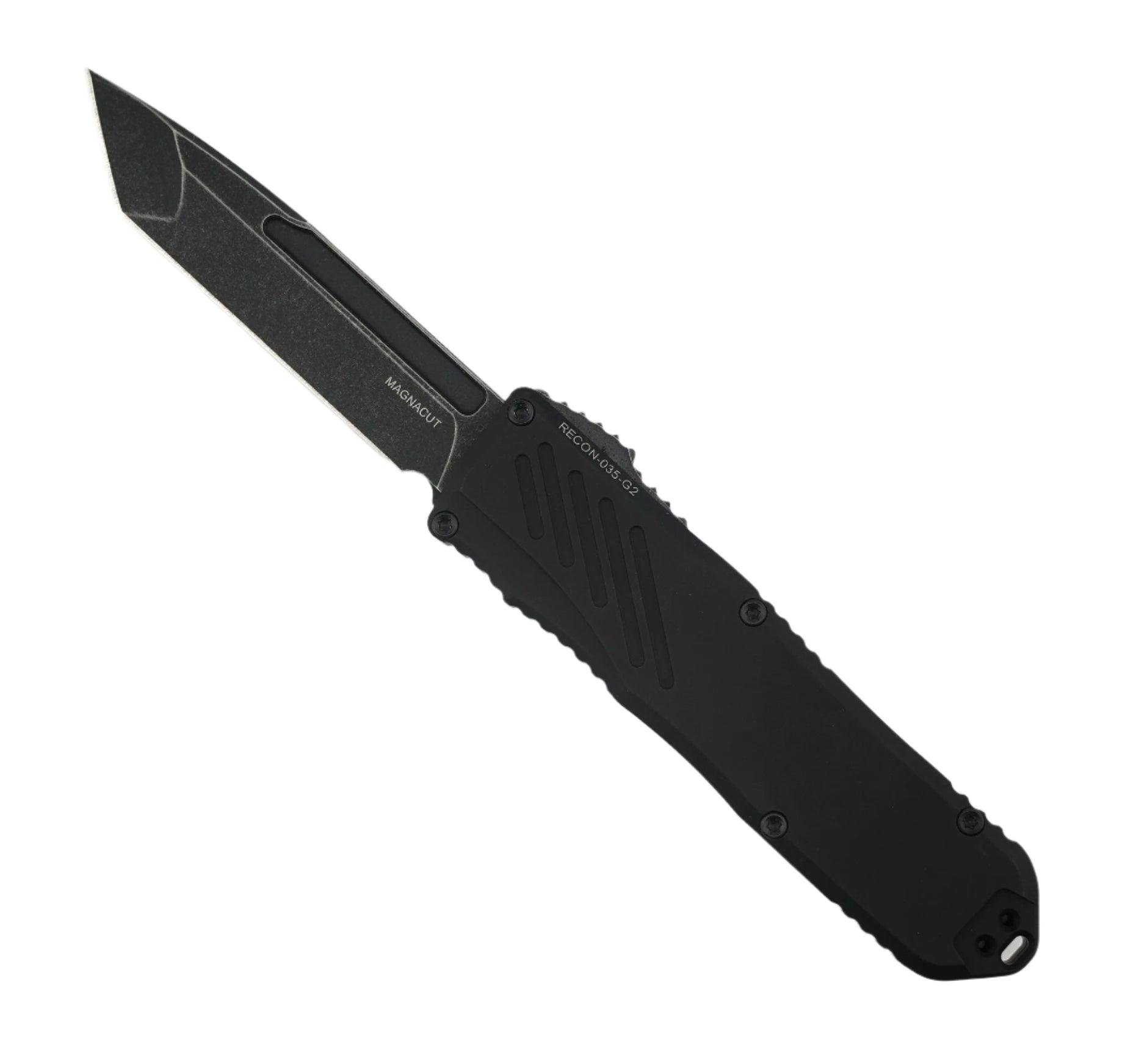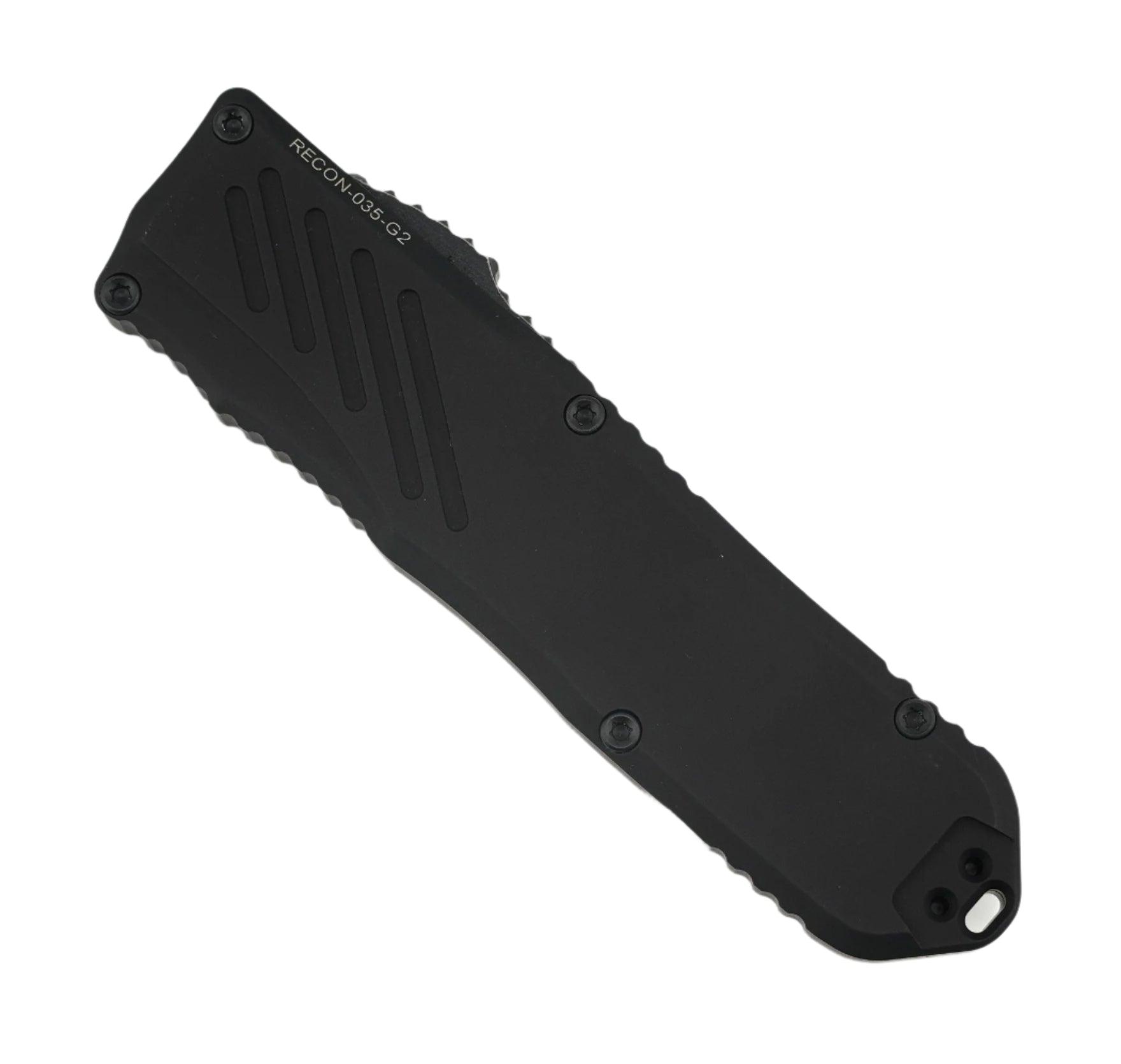 The Recon-035 Double-Action Automatic has an overall length of 8” and a closed length of 4.5". The 3.375" fine edge, Tanto-point blade is made of dark stonewash finished MagnaCut stainless steel. The black Type lll Hardcoat Anodized Aluminum handle is approx. 7/16" thick and has milled traction slots for a non-slip grip. The dark stonewash thumb slide rides on a stainless steel plate with ceramic balls to reduce friction. It features all black hardware with a dark stonewash, serial numbered pocket clip for tip-down carry. It also has a lanyard hole.