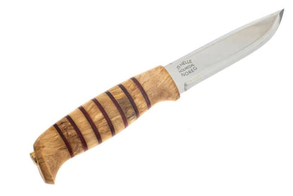 Helle Knives JS Limited Edition Fixed Blade (676 JS) - 4.33" Sandvik 12C27 Satin Laminated Drop Point Blade, Curly Birch w/ Red Leather Inlets Handle, Tan Leather Sheath