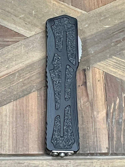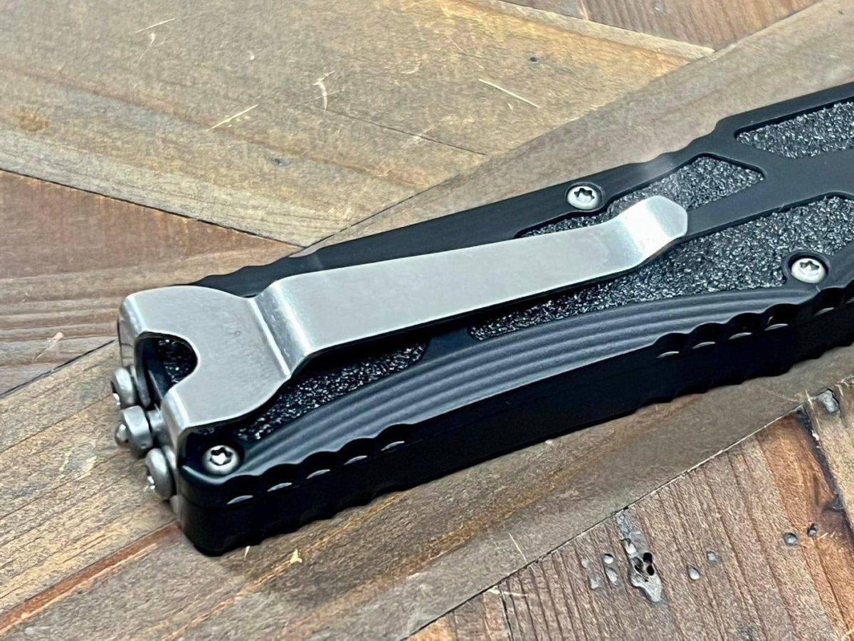 Check out the ultra popular Colossus double action OTF Auto knife from Heretic with its black handles and intricate appearance, overbuilt toughness, faster than lightning action, and fit and finish you’d expect from a high-end knife. The blade is made from the ultra premium CPM-MagnaCut stainless steel with a single edge clip point shape that is just superb. The hefty aluminum body is exceptionally ergonomic and features a myriad of black traction inlays on each side. The reversible pocket clip is the most subtle thing about this knife. It holds the knife securely in the pocket while subtracting little from the ergonomics, which we love. The blade comes with a bottle of OTF Knife Lube and proudly made in the USA!