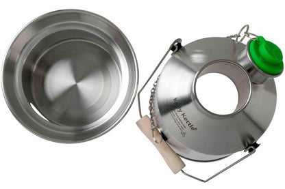 This Scout edition of the Kelly Kettle can be filled with 1.2 litres of water. In terms of material a decent and sustainable type of stainless steel was chosen. At first this might look like a heavy option, but with a total weight (kettle and fire base) of 1050 grams it is not that heavy at all. Practical is the fact that you can turn the fire base upside down and store it in the kettle to save room. A simple carrier bag is included with the Kelly Kettle.
