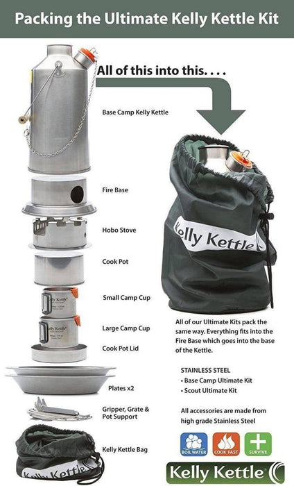 - 100% MONEY BACK GUARANTEE. The Base Camp Ultimate Kit includes Stainless Steel Base Camp Kettle, Cook set, Large Hobo Stove, Kelly Kettle Pot Support, 2 Stainless Steel Camping Cups, 2 Stainless Steel Camping Plates, Storage Bag. All items fit neatly within the kettle itself for transport / storage.