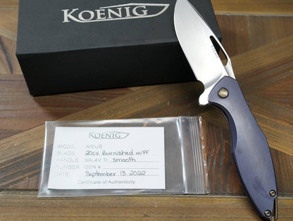 Limited Only 1 Available: This is a beautiful Koenig Arius Titanium Knife with a 20CV Premium Steel burnished with polished Flats Blade and anodized bronze hardware. This frame lock pocket knife features a 20CV blade with bearing pivot for quick and smooth opening. Includes lightening pockets in the frame for weight reduction.