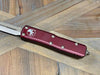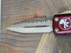 Microtech 232-15MR UTX-85 Bronze Merlot Full Serrated Blade has a stonewash full serrated blade finish. Double action Out the Front (OTF) knife. Merlot anodized 6061-T6 aluminum handle with stonewash 204P or M390 partially serrated steel blade. 3.125" long blade, 7.50" overall tip down carry.