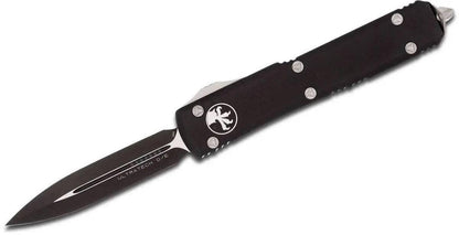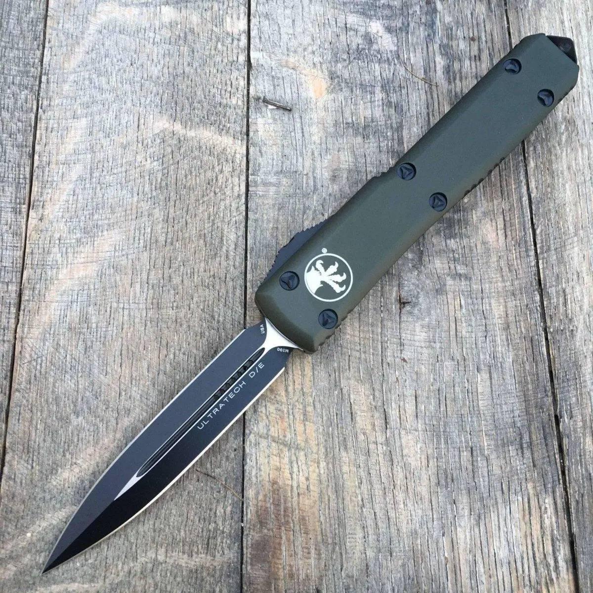 Microtech famious Ultratech features a double-edged dagger blade with a black finish and plain cutting edges. It has a contoured, OD green anodized 6061-T6 aluminum handle with a black finished pocket clip, glass breaker, and stainless steel hardware.