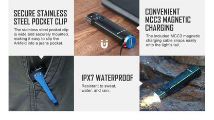 The Arkfeld is the first dual light source and portable EDC Flashlight at Olight. 2 color temperatures, 5 brightness levels, and a memory function that allows you to select what you like with one click. An amazing max 1,000 lumens output can light up every corner you can see. The green laser, a good helper when making a presentation or amusing your pets, is also featured in the flashlight. The creative switch design (Central Button & Selector) is both practical and beautiful. Besides, the magnetic charging cable enables you to have it charged automatically. Last but not least, the flashlight is flat and features a clip, so it is easy to carry (3.07oz in weight and 0.59in in thickness) - It can be clamped onto your pockets and shirts even without noticing its existence. With great design plus multiple lighting functions, Arkfeld can be a second-to-none choice for an EDC flashlight.