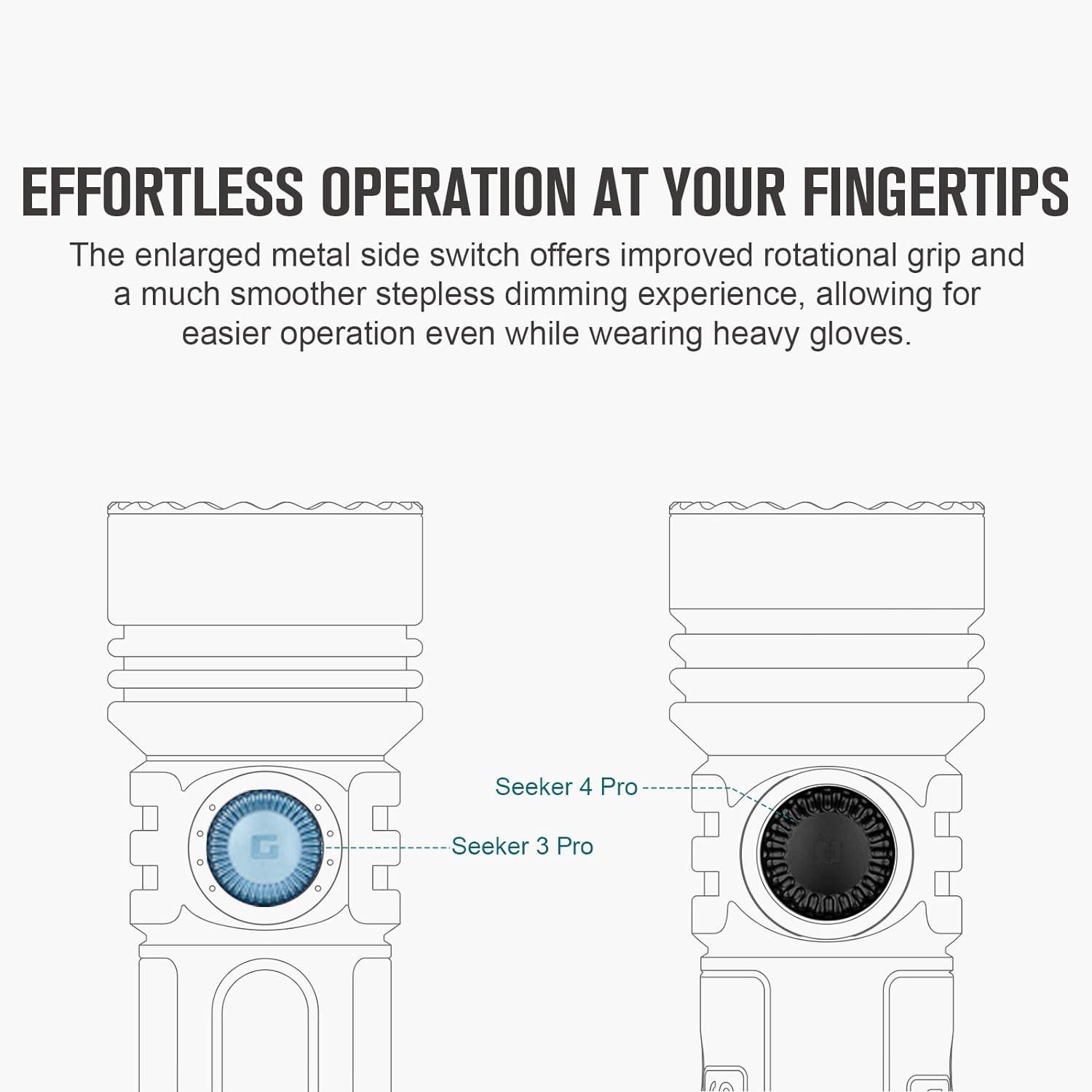 Expert Performance - The Seeker 4 Pro rechargeable flashlight boasts an impressive output of 4,600 lumens and a maximum throw of 260 meters. A versatile holster adds both convenience and safety with a pull-out unlock function, charging capabilities, and various carrying options. This powerful flashlight offers two charging options for ease of use: Type-C charging with the included holster or magnetic charging with optional MCC3. The enlarged metal side switch allows for easy rotation, with 360° dimming or long-press dimming, even when wearing heavy gloves in the dark. Additionally, the new hidden brightness and battery indicators maintain the flashlight's IPX8 waterproof rating, ensuring worry-free use in any environment.