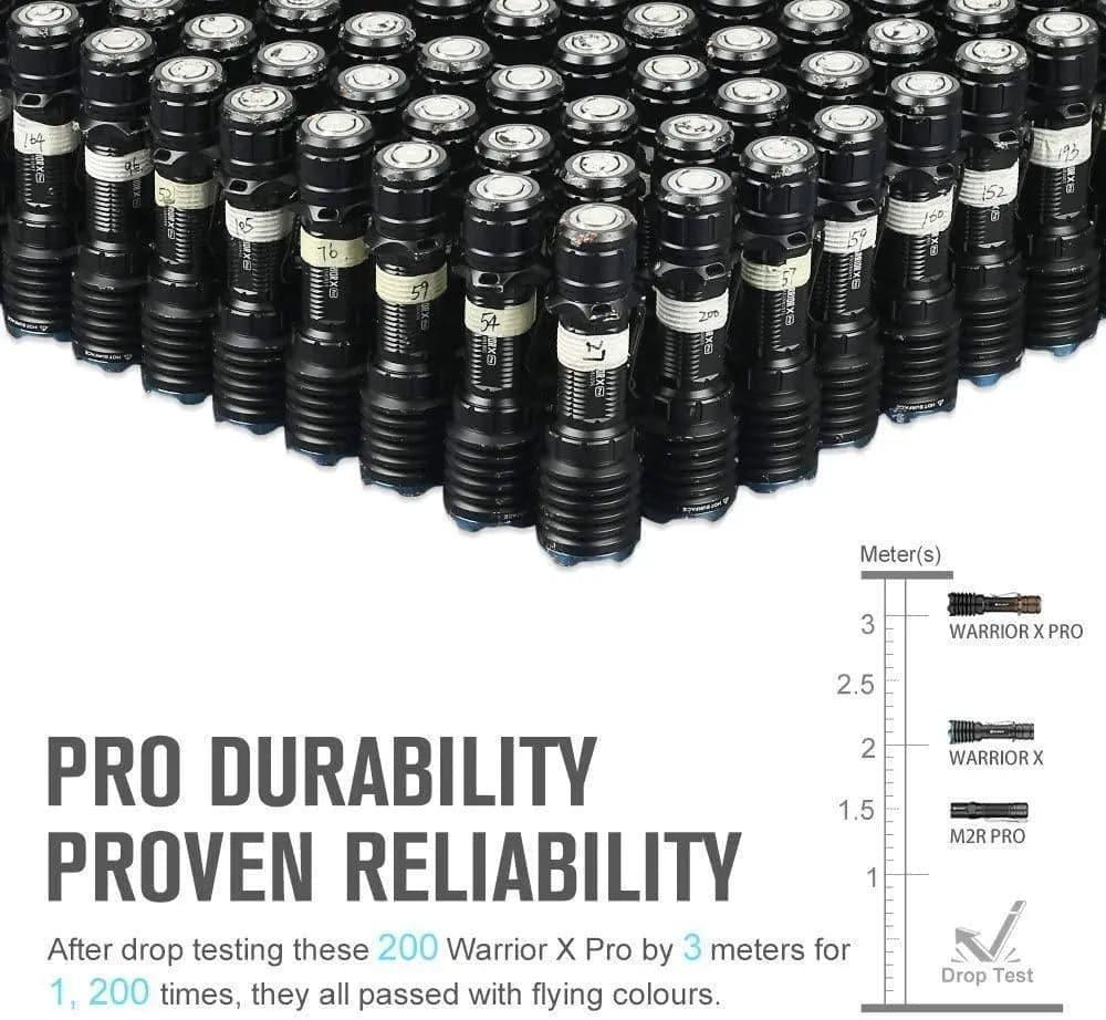 | Unique Characteristics | (1) Using a customized 5000mAh 21700 lithium battery, the Warrior X Pro produces an incredible 2,250-lumen output and 600-meter throw allowing you to see in any harsh situation. (2) The redesigned raised tactical tail switch comes with stronger magnetism, and aggressive body knurling for a firmer grip, giving you a simpler interface and operation experience than ever. (3) Quickly get back in action with the super-efficient MCC3 charging cable which holds 2A current for 100% doubled faster charging than Warrior X. (4) Sturdy Heavy-duty build with a thick IPX8-rated aluminum alloy body, making it tough enough to endure a harsh 3-meter drop test. (5) All tactical classics in one: vibration battery indicator, silicone tactical ring, etc. Just feel the sensation of absolute robustness in your hand. |
