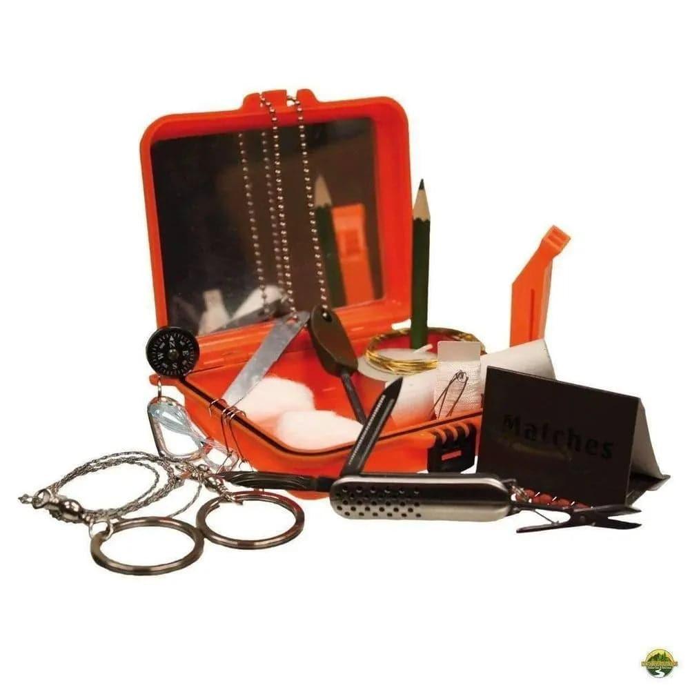Need a survival kit that's inexpensive and you can throw into your bug-out bag? The Red Rock Survival Kit offers a great product that comes in a orange hard case with attachment clip (4 1/2" x 3 1/2" x 1 1/4"). Kit includes: built-in mirror, attachment clip, pencil, waterproof paper, matches, flint striker, tea-light candle, survival whistle with belt clip, pocket knife/multi-tool, fishing kit, 2-safety pins, 40' of nylon twine, 6' snare wire, 2-cotton balls, 1 meter duct tape, wire saw, compass, resealable poly-bag. Weight: 2.0 lbs.