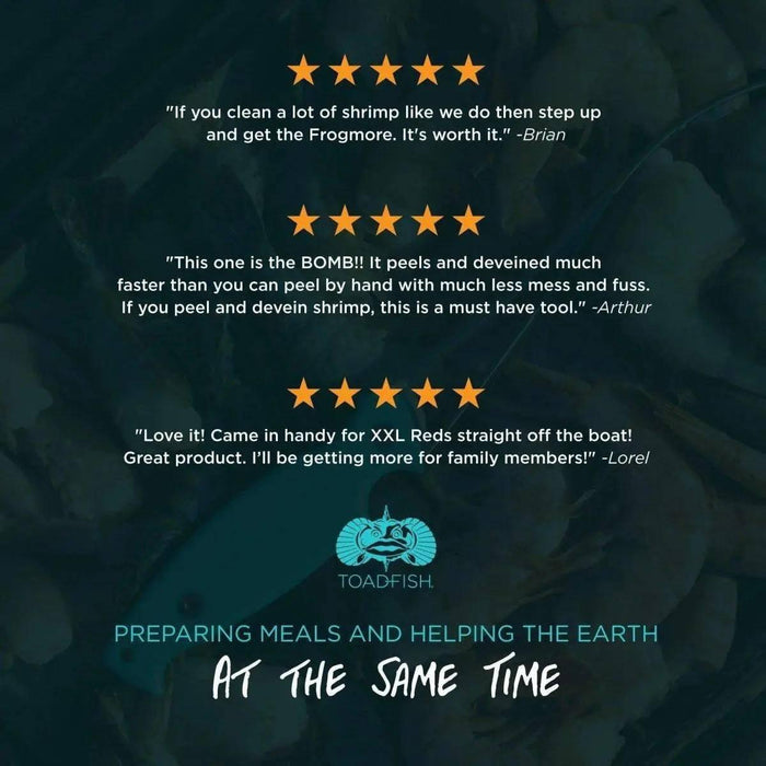 Toadfish Outfitters has taken the painstaking 3-step process of preparing shrimp and streamlined it. Introducing the Frogmore Shrimp cleaner. This first-of-its-kind shrimp tool that allows you to peel, devein, and butterfly shrimp in one single smooth motion. Elegantly designed and easy to use, it gives you a perfect shrimp every time. Toadfish Outfitters also gives back. For every product sold Toadfish Outfitters is committed to building new oyster habitats. Oysters act as nurseries for marine animals of all kinds, including shrimp. Point Blade Butterflies & Cleans Top Quality Stainless Steel Full Tang Construction Provides Maximum Strength Ergonomic Handle is Made From Recycled Materials U.S. Patent No. D846362