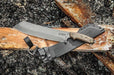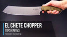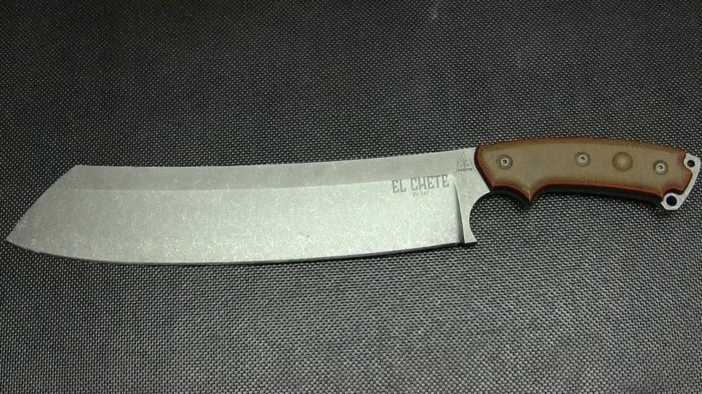 El Chete is the first TOPS knife to be released with our wicked new finish called Acid Rain. Because of the process we use, the finish varies slightly from knife to knife so that each person gets something unique. We wanted the handles to be thick enough to fill each user's hand like a hatchet or small ax handle would, so we decided to use sandwiched Micarta. It's well rounded for comfort and the black canvas Micarta underneath the green canvas Micarta adds even more to the aesthetics of this piece.