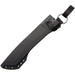 The sheath is an out-the-front design with all the bells and whistles. You just pull up slightly then out the front so that you don't have to strain to pull the knife all the way up through the sheath. There is a strap that when snapped into place, helps immensely with the retention of the blade. We've also made it available with our rotating spring steel clip or a leather dangler attachment so that each user picks the right fit for him or her.