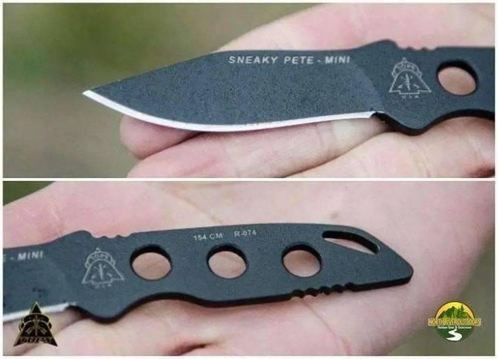 "The Sneaky Pete Mini is a scaled down, thinner version of the Sneaky Pete. However, the handle is grooved for the ring and little finger on the bottom of the handle and with thumb grooves on the top. It is a small, thin knife (for TOPS anyway). It's a Tactical Utility knife.